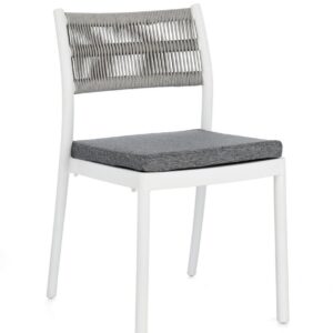 POLIPROPILENE (PP), RESISTENTE AI RAGGI UV. SCHIENALE CON INTRECCIO IN CORDA DI POLIESTERE. CUSCINO SEDUTA SFODERABILE CON TESSUTO IDROREPELLENTE POLIESTERE. IMPILABILE.